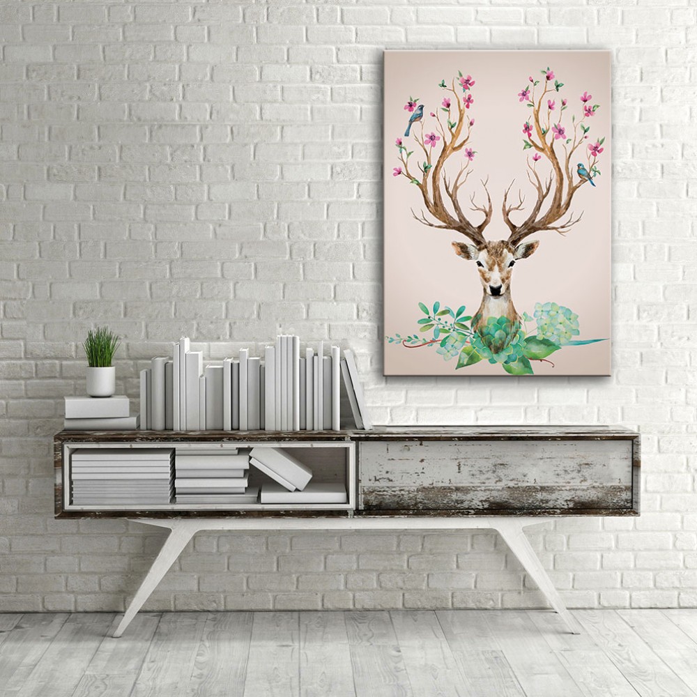 Çiçekli Geyik Kafası Dikey Kanvas Tablo